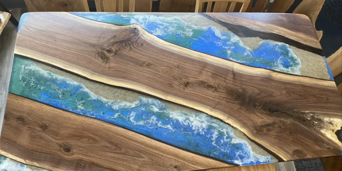 Ocean tables are designed to capture the movement and depth of coastal water using layered resin techniques, custom pigments, and optional sand, stone, or textured backgrounds. From subtle shoreline-inspired designs to bold, wave-driven ocean scenes.